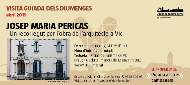 Josep Maria Pericas i Morros (Vic, 1881 – Barcelona, 1966) és un dels arquitectes catalans més importants del segle XX. Amb aquest recorregut, que ja va començar aquest passat diumenge 7 d’abril, es vol donar a conèixer una visió de la seva arquitectura i elements decoratius i dissenys que es troben a la ciutat i mostrar així la riquesa de la seva obra a Vic.