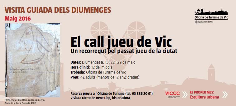 Els diumenges del mes de maig, l’Oficina de Turisme de l’Ajuntament de Vic encetarà una nova visita guiada en la qual es farà un recorregut pel passat jueu de la ciutat. Aquestes visites aniran a càrrec de l’historiadora, Irene Llop.
