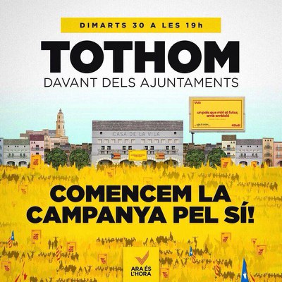 29/09/2014 ARA ÉS L’HORA es mobilitzarà demà dimarts a les places dels ajuntaments si el TC suspèn aquest vespre el 9N Compartir: ARA ÉS L’HORA es mobilitzarà demà dimarts a les places dels ajuntaments si el TC suspèn aquest vespre el 9N Facebook Twitter Whatsapp Email