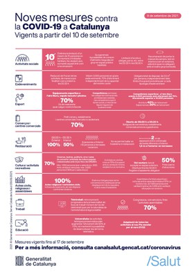 10/09/2021 El divendres 10 de setembre entren en vigor les noves mesures sanitàries per fer front a la pandèmia Compartir: El divendres 10 de setembre entren en vigor les noves mesures sanitàries per fer front a la pandèmia Facebook Twitter Whatsapp Email
