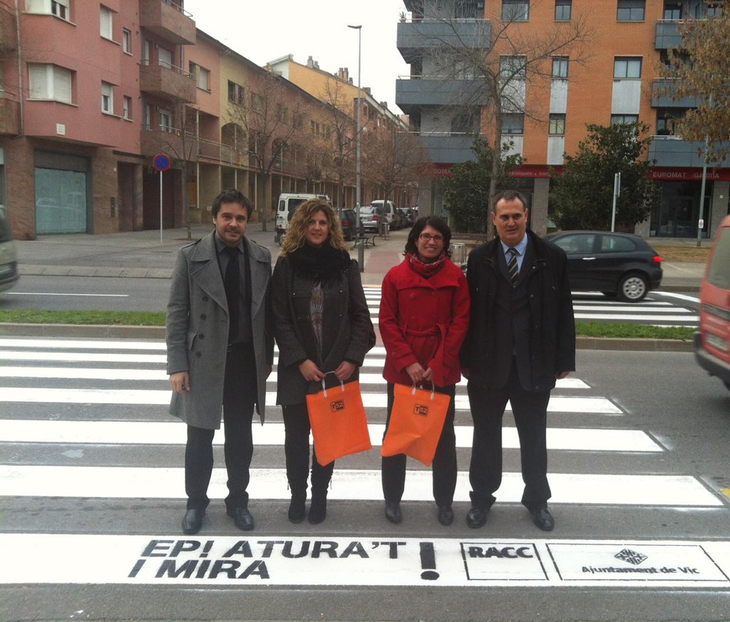 Aquest dimecres, l’Ajuntament de Vic va presentar l’última acció de la campanya “Vic, movem-nos amb seguretat”, realitzada conjuntament amb la Fundació RACC. Concretament, es tracta de pintar diversos passos de vianants de la ciutat amb la frase‘Ep! Atura’t i mira!’, amb l’objectiu de disminuir els atropellaments en passos de vianants.