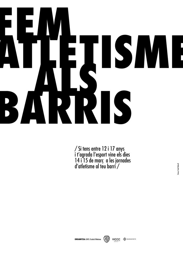 Aquest cap de setmana, 14 i 15 de març, la ciutat de Vic acull unes jornades d’atletisme als diferents barris de la ciutat adreçada a joves. La iniciativa està promoguda pel Club Atlètic Vic - Escola d’Atletisme i amb el suport de l’Ajuntament de Vic i té com a finalitat apropar aquest esport als joves dels barris.