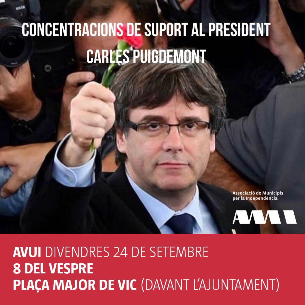 Avui, divendres 24 de setembre a les 8 del vespre l’Ajuntament de Vic se suma a la convocatòria feta per l’Associació de Municipis per la Independència (AMI) perquè la ciutadania es concentri davant dels ajuntaments per mostrar el seu suport al legítim president Carles Puigdemont, detingut per la policia italiana a l’Alguer.