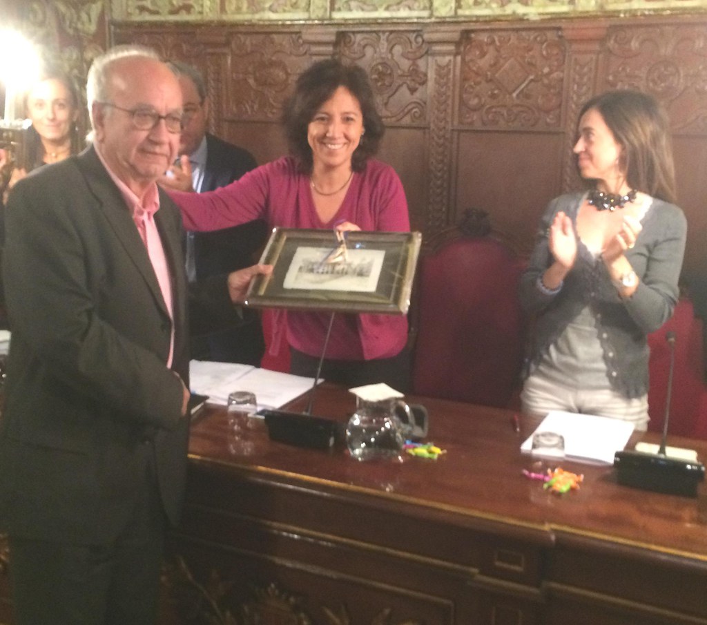 Un moment de la sessió plenària d’ahir quan l’alcaldessa va lliurar un obsequi a  l’interventor de l’Ajuntament de Vic que es jubila.