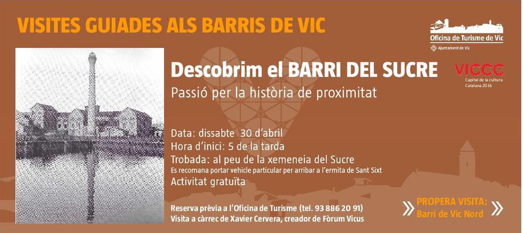 La visita començarà el seu recorregut a les 5 de la tarda des del peu de la xemeneia del Sucre i està previst que tingui una durada de dues hores. Tots els interessats en apuntar-s’hi cal que es posin en contacte amb l’Oficina de Turisme de l’Ajuntament de Vic (turisme@vic.cat; 93 886 20 91; o presencial- plaça del Pes-), ja que les places són limitades.