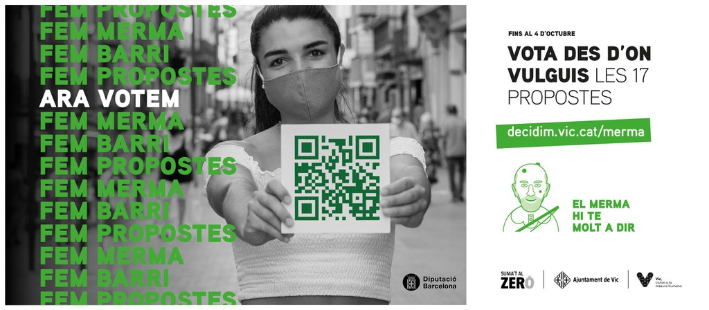 A partir del 14 de setembre i fins al 4 d’octubre es podran votar 17 de les propostes fetes pels veïns i veïnes de la zona verda del Merma als pressupostos participatius de Vic d’aquest any, amb una partida destinada de 200.000 euros. L’exposició virtual de tots els projectes (inclòs el llistat dels que no s’han acceptat i el motiu pel qual han estat rebutjats) es podrà consultar a partir del 14 de setembre al mateix web on també es podrà fer la votació: www.decidim.vic.cat. Les persones que no disposin d’internet podran emetre el seu vot al Centre Cívic Can Pau Raba (c/ Raval Cortines, 24) o bé a l’Oficina de Turisme (plaça del Pes, s/n).
