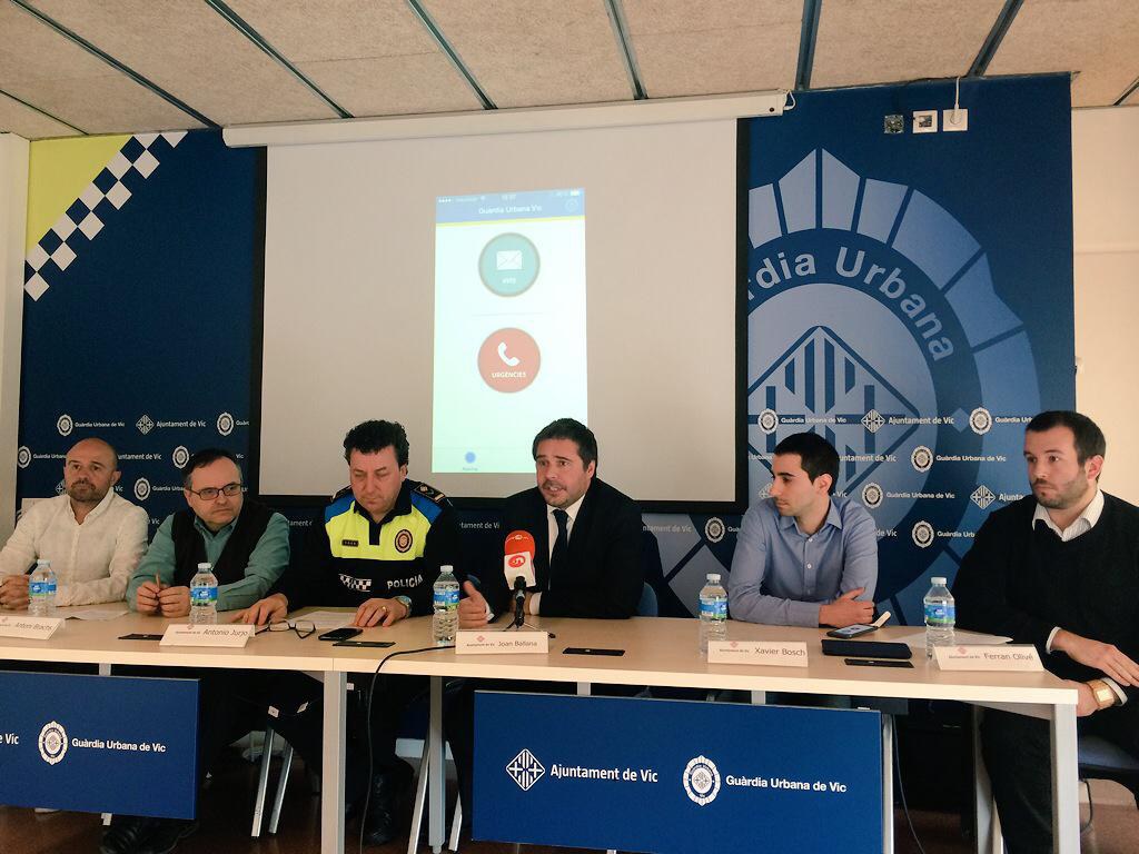 Aquest migdia s’ha presentat l’aplicació de la Guàrdia Urbana de Vic dirigida als establiments comercials. El regidor de Convivència i Seguretat, Joan Ballana, ha estat acompanyat dels desenvolupadors de l’aplicació, Xavier Bosch i Ferran Olivé, de l’empresa Swarmlock; dels vicepresidents de Vic Comerç, Antoni Brachs i Marc Carol; i del cap de la Guàrdia Urbana, Antoni Jurjo.