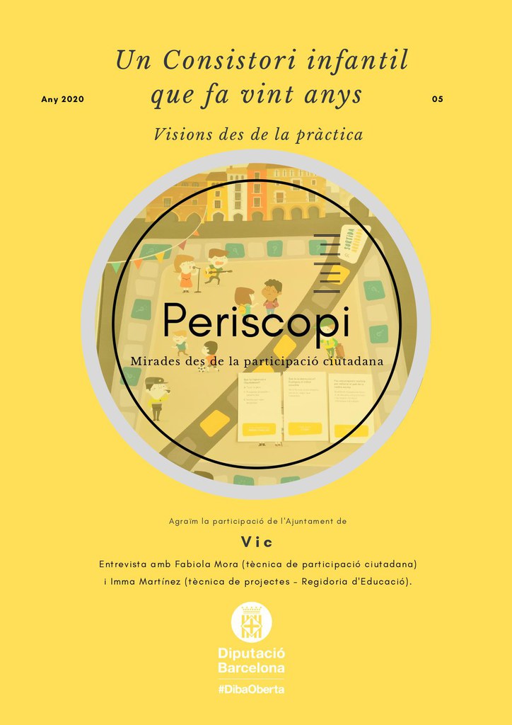El Consistori Infantil de Vic, que enguany compleix 20 anys, és el protagonista en exclusiva del número 5 de la revista Periscopi, publicació bianual editada pel Servei de Participació Ciutadana de la Diputació de Barcelona. Aquest número de la revista, publicat aquest dimarts 2 de juny i difós en línia per a tots els ajuntaments de la demarcació de Barcelona, és una edició monogràfica íntegrament dedicada al consistori vigatà, el qual es posa com a exemple de bones pràctiques en participació ciutadana.