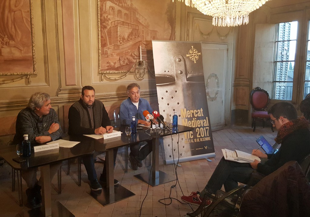 El Mercat Medieval de Vic s’instal·larà a la ciutat del 6 al 10 de desembre, amb més de 300 parades de tot tipus de productes i artesanies i diverses activitats que recreen l’ambient d’aquells temps com músics, dansaires, passa carrers, teatre i un campament de recreació de l’edat mitjana, entre d’altres. El regidor de Fires i Mercats, Benjamí Dòniga, el regidor de Ciutadania i Igualtat, Josep-Ramon Soldevila i el director de teatre, Pep Simon, han presentat aquest dimarts a la tarda l’edició d’enguany a la Casa Prat, un dels nous escenaris de L’Assalt de l’Altarriba, el recorregut teatral basat en fets històrics ocorreguts al Segle XV a Vic, que aporta contingut cultural i patrimonial al Mercat Medieval, des de fa 5 anys.