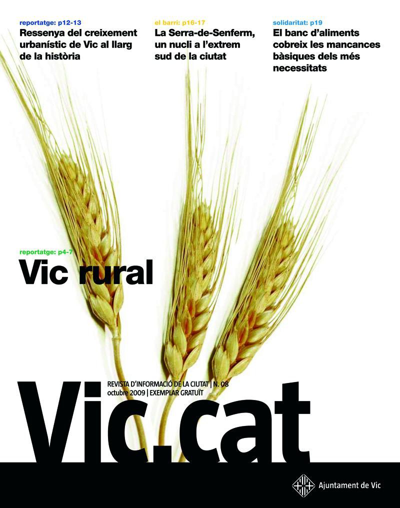 Avui dimecres, dia 21 d’octubre, ha sortit al carrer el número 8 de la revista Vic.cat. El reportatge central es basa en el món rural a partir de tres experiències diferents del que suposa la vida al camp a banda de totes les accions que està impulsant el consistori vigatà per tal de millorar la qualitat de vida dels veïns i veïnes. És el cas de la pavimentació de diversos camins rurals; la nova senyalització de les cases de pagès; la nova xarxa d’abastament d’aigua, entre altres.A banda d’aquest reportatgel, la revista també inclou un escrit dedicat al Banc d’Aliments. També hi ha una pàgina dedicada al Consell de Ciutat; un reportatge de la bona acollida que estan tenint els tallers dels Centres Cívics, entre altres. En un context de crisi econòmica, l’Ajuntament de Vic ha hagut d’ajustar algunes partides pressupostàries i una d’elles ha estat precisament la de la revista municipal. La previsió des del seu inici era l’edició de 4 revistes l’any: març / juny / setembre i desembre; però davant d’aquest context econòmic s’ha retallat un número que havia de sortir al carrer el passat setembre i s’ha posposat fins aquest mes d’octubre. Per veure la revista el complet podeu adreçar-vos a la pàgina web de l’Ajuntament: www.vic.cat.