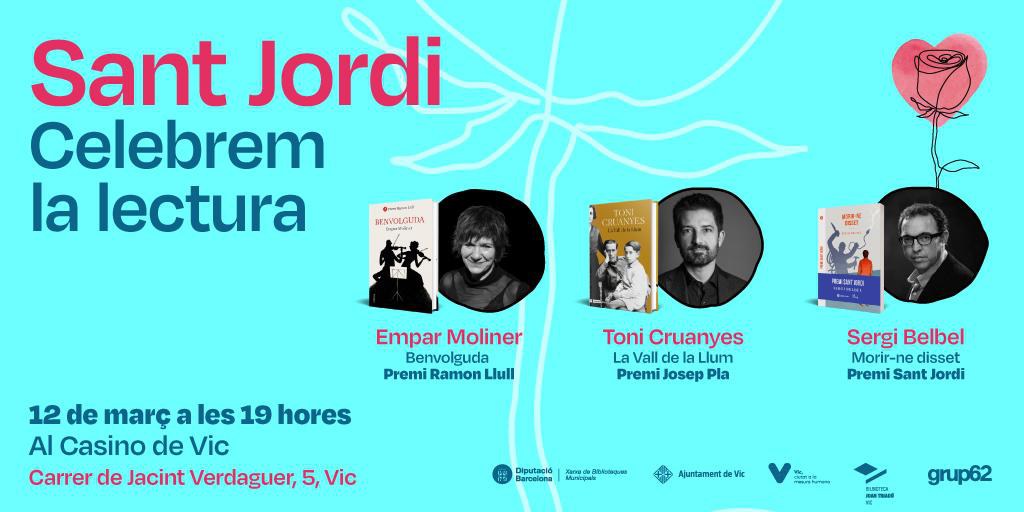 Empar Moliner, Toni Cruanyes i Sergi Belbel presentaran les seves obres a la ciutat de Vic després d’haver estat guardonats amb els principals premis literaris del país. Serà aquest dissabte 12 de març a les 7 de la tarda al Casino. D’aquesta manera, tal com exposa la regidora de Cultura, Bet Piella, es consolida l’acte que es va iniciar fa sis anys amb la Capitalitat de la Cultura Catalana de Vic (VICCC) amb el Grup 62.