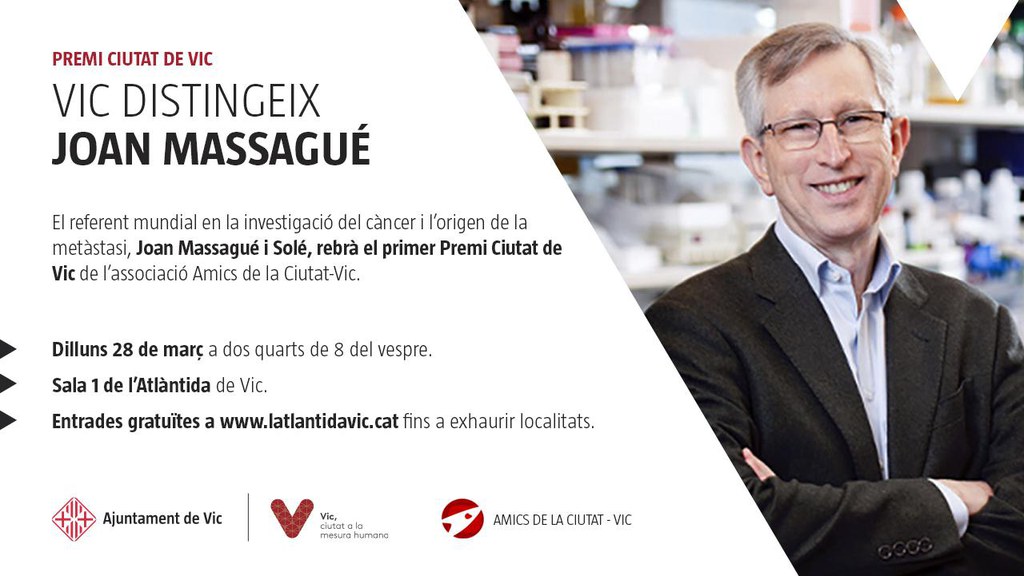 La primera edició del Premi Ciutat de Vic, un certamen promogut per l’associació Amics de la Ciutat-Vic, distingirà el científic Joan Massagué, un referent mundial en la investigació del càncer i l’origen de la metàstasis. Serà en una gala el dilluns 28 de març a dos quarts de 8 del vespre a l’Atlàntida i per assistir-hi es pot obtenir l’entrada gratuïta en aquest enllaç.