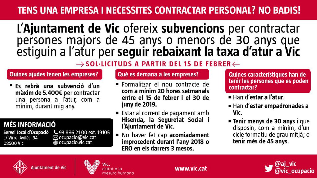 Per accedir a aquest ajut econòmic les empreses hauran de formalitzar el nou contracte de com a mínim 20 hores setmanals, entre el 15 de febrer i el 30 de juny d’aquest any. A més, han d’estar al corrent de pagament amb Hisenda, la Seguretat Social i l’Ajuntament de Vic, i no haver fet cap acomiadament improcedent durant l’any 2018 o ERO en els darrers 3 mesos.