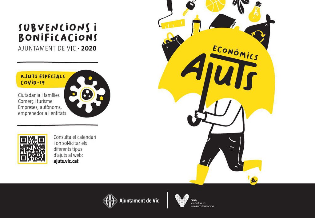 L’Ajuntament de Vic té en marxa per a aquest 2020 una bateria d’ajuts econòmics, en forma de subvencions i bonificacions, per ajudar col·lectius específics, empreses, comerços i tota la ciutadania en general. En total són 52 mesures que, en l’actual situació de crisi sanitària, econòmica i social, prenen més importància que mai i volen contribuir a reactivar l’economia de la ciutat, pal·liar les dificultats que poden tenir les famílies, les empreses, els comerços i els col·lectius més vulnerables en moments com aquest i alhora premiar activitats sostenibles de tots els veïns i veïnes de Vic, entre altres.