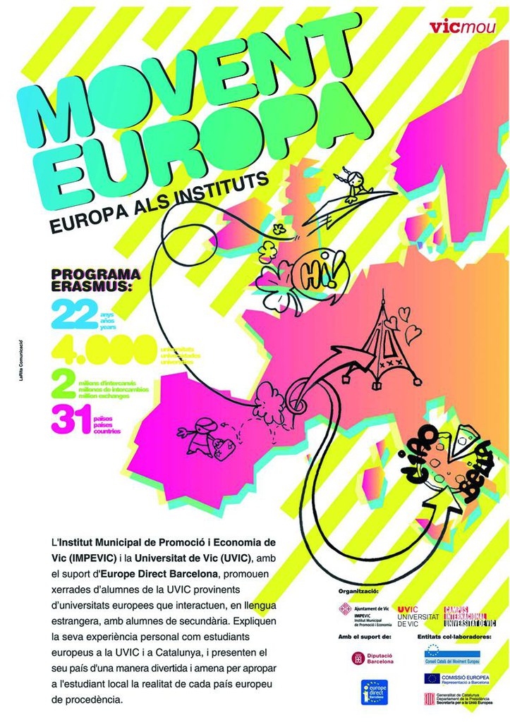 “Movent Europa. Europa als instituts” és el títol de la campanya que han endegat conjuntament l’Institut Municipal de Promoció i Economia de Vic (ImpeVic) i la Universitat de Vic (UVic) amb l’objectiu de promoure xerrades d’alumnes de la UVic que provenen d’universitats europees als centres de secundària. Una campanya per sensibilitzar als joves sobre aspectes aplicats del funcionament de la Unió Europea. De moment la xerrada ja s’ha fet a l’IES Vic i en els pròxims dies es faran als centres Sant Miquel i Escorial. Aquestes xerrades es fan íntegrament en llengua anglesa.Mitjançant aquest projecte, els estudiants de secundària de Vic i Osona tenen l’oportunitat d’aprendre anglès d’una manera diferent i lúdica, i conèixer diferents països de la Unió Europea, alhora que aprenen què és i com funciona el programa Erasmus, d’intercanvi universitari dins la Unió Europea, en el qual podran participar en un futur proper si escullen accedir a estudis superiors. D’altra banda, els estudiants internacionals de la UVic tenen l’oportunitat de conèixer de primera mà com funcionen els instituts catalans, i ser professors d’anglès per un dia. La selecció dels estudiants internacionals es fa en funció del seu nivell de llengua anglesa, la motivació que mostren per presentar el seu país a estudiants de secundària i la seva participació activa en les activitats que s’organitzen des de l’Àrea de Relacions Internacionals de la UVic.Aquest projecte acaba d’estrenar-se i només s’ha efectuat una visita, però la valoració per part dels responsables de l’ImpeVic, dels estudiants i professors de secundària, així com dels estudiants internacionals i personal de la UVic, és molt positiva i podrà créixer en propers cursos. Aquest projecte de sensibilització del fet europeu a partir de la utilització de la llengua estrangera en centres de secundària és innovador i esdevé un cas de bones pràctiques que compta amb el suport d’entitats com Europe Direct Barcelona, Diputació de Barcelona, Consell Català del Moviment Europeu, Representació a Barcelona de la Comissió Europea i Secretaria per a la Unió Europea de la Generalitat de Catalunya. Aquest ampli suport institucional també ha de permetre que durant el present curs acadèmic s’obri la iniciativa als centres de secundària de la comarca que hi estiguin interessats.