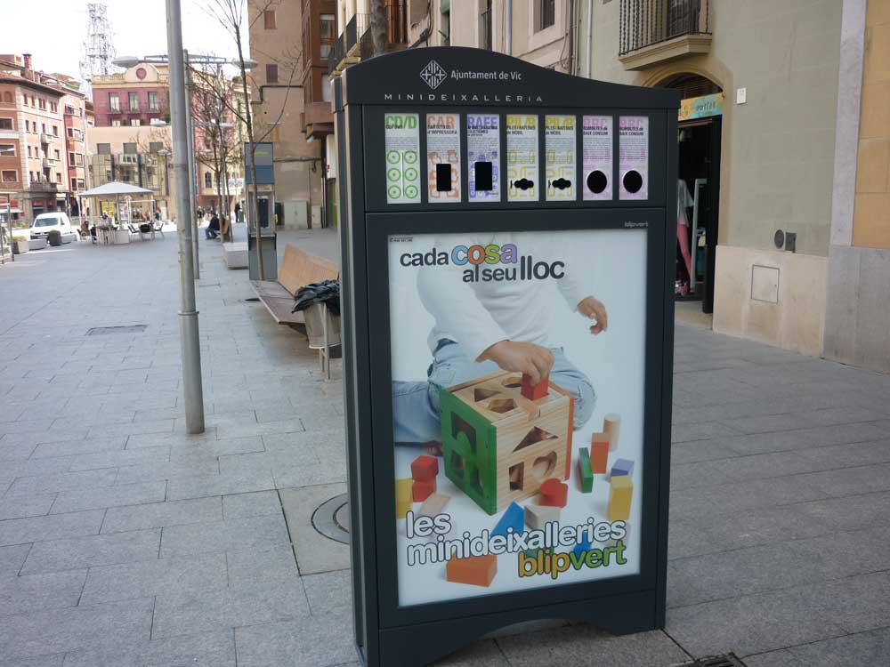 Les minideixalleries són uns panells que disposen de diverses bústies per dipositar-hi petits residus especials d’origen domèstic. Hi podeu portar piles, bateries de mòbil, bombetes, CDs, DVDs, cartutxos d’impressora, aparells elèctrics i electrònics de petit format (mòbils, calculadores,…).