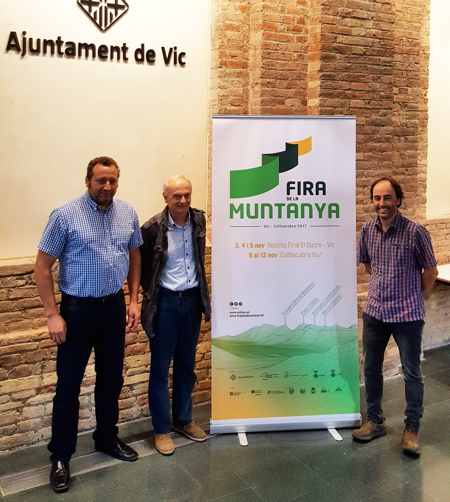 El regidor de Fires i Mercats, Benjamí Dòniga, l’alcalde de l’Esquirol, Àlex Montanyà, i el representant de l’Associació d’Editors en Llengua Catalana, Miquel Ylla Boré, van presentar ahir al matí la propera edició de la Fira de la Muntanya Vic-Collsacabra 2017, que proposa prop d’un centenar d’activitats relacionades amb l’esport, la natura i el muntanyisme durant els dos primers caps de setmana de novembre.