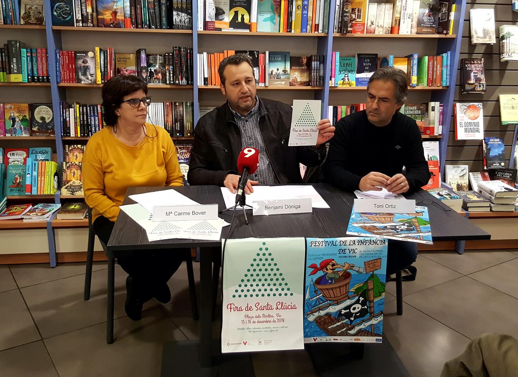 Aquest cap de setmana, la plaça dels Màrtirs acollirà una nova edició de la Fira de Santa Llúcia. El regidor de Fires i Mercats de l’Ajuntament de Vic, Benjamí Dòniga, i la regidora de Comerç i Consum, Maria Carme Bover, han explicat aquest matí els detalls d’aquesta cita comercial, acompanyats de Toni Ortiz, responsable del Festival de la Infància, que ha donat a conèixer la proposta que ha preparat aquest any pels més petits.