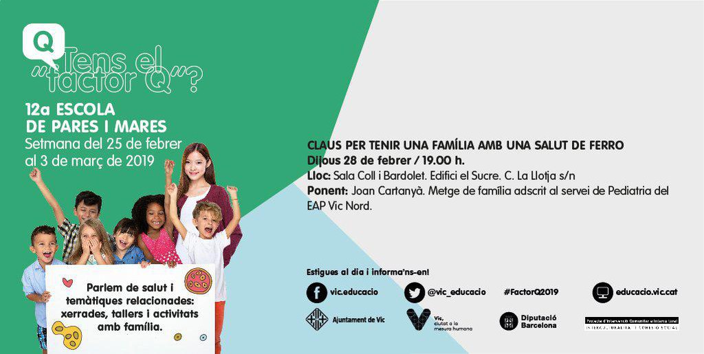 Un any més, arriba a la ciutat la programació de l’Escola de Pares i Mares: ‘Tens el Factor Q?’, que aquest any assoleix la seva dotzena edició, i que tindrà lloc entre el 28 de febrer i l’11 d’abril. Aquesta iniciativa, organitzada conjuntament amb totes les AMPA de la ciutat i sota el marc del Projecte Comunitari Intercultural, busca oferir una programació de qualitat a través de propostes formatives impulsades des dels centres educatius, des d’entitats del tercer sector i des de l’administració. Així, de manera conjunta i coordinada s’organitza una programació complerta amb l’objectiu d’arribar al màxim de públic.