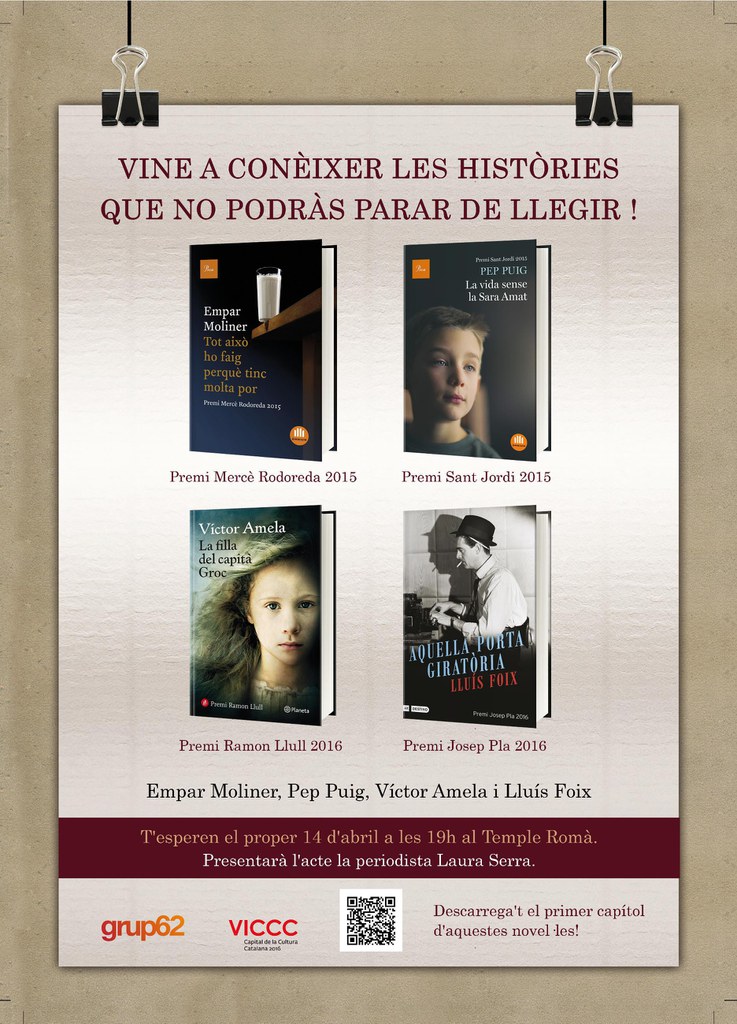 En el marc de Vic Capital de la Cultura Catalana 2016, Grup62 ha organitzat una taula rodona amb Empar Moliner, Pep Puig, Víctor Amela i Lluís Foix. L’acte, presentat per la periodista Laura Serra, servirà per conèixer i endinsar-nos en les històries més captivadores del moment.