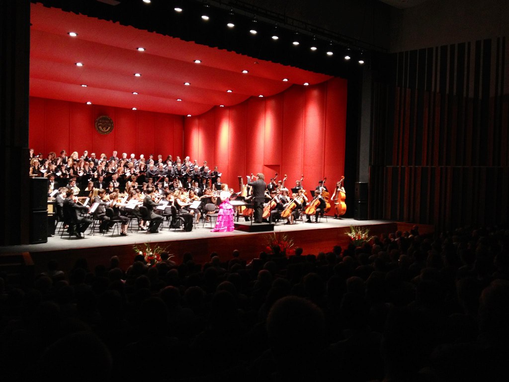 El concert es va iniciar amb la interpretació de Bayo i les dues corals de fragments del poema Peer Gynt, d'Edvuard Grieg. Aquests fragments que es van poder sentir a L'Atlàntida sóc poc habituals i poc coneguts per part del públic. Tot seguit, es va homenatjar als compositors catalans Frederic Mompou, que enguany es commemora el 25è aniversari de la seva mort, i del qual es va interpretar Combat del somni; i Xavier Montsalvatge, que es van interpretar Cinc cançons negres, en motiu del centenari del naixement de l'artista. Per altra banda, també es van sentir fragments de l’obra coral simfònica de Pau Casals El Pessebre. En la part final, Maria Bayo va oferir una extraodinària interpretació de l'obra cubana Cecília Valdés, que va fer posar el públic de la sala dempeus. El concert inaugural va acabar amb El Cant dels Ocells, de Pau Casals.