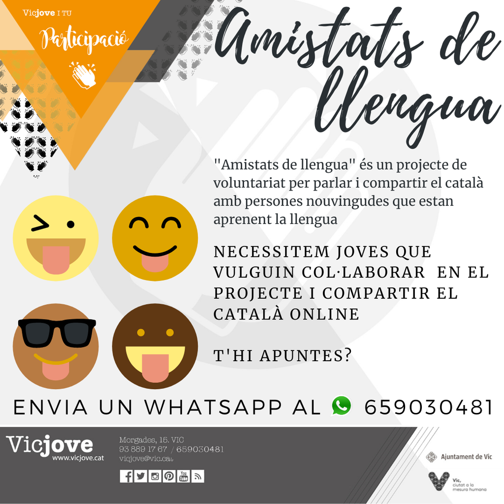 Aquest mes de juny es posarà en marxa a Vic el projecte Amistats de llengua, un programa d’intercanvi lingüístic per a joves nouvinguts d’entre 16 i 25 anys, aproximadament, perquè puguin aprendre el català i intercanviar experiències amb altres joves que viuen a la ciutat. La idea és crear parelles lingüístiques que estableixin trobades virtuals (videotrucades, videoconferències o whatsapp) amb regularitat, en les quals s’aprofundeixi en el coneixement de l’idioma però alhora també serveixi de canal per vincular el jovent nouvingut a la ciutat.