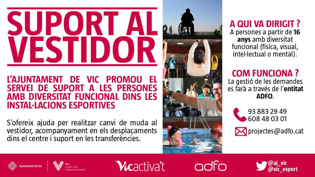 L’Ajuntament de Vic posa en marxa una prova pilot de suport al vestidor per a persones amb diversitat funcional a les piscines municipals Joan Riera-Club Natació Vic ETB. El regidor d’Esports, Titi Roca, explica que aquesta iniciativa neix amb la intenció de donar resposta a les necessitats que es troben les persones amb diversitat funcional que són usuàries de les instal·lacions esportives. Roca exposa que la prova pilot permetrà avaluar la funcionalitat del programa i poder-ho implementar en d’altres centres esportius de Vic.