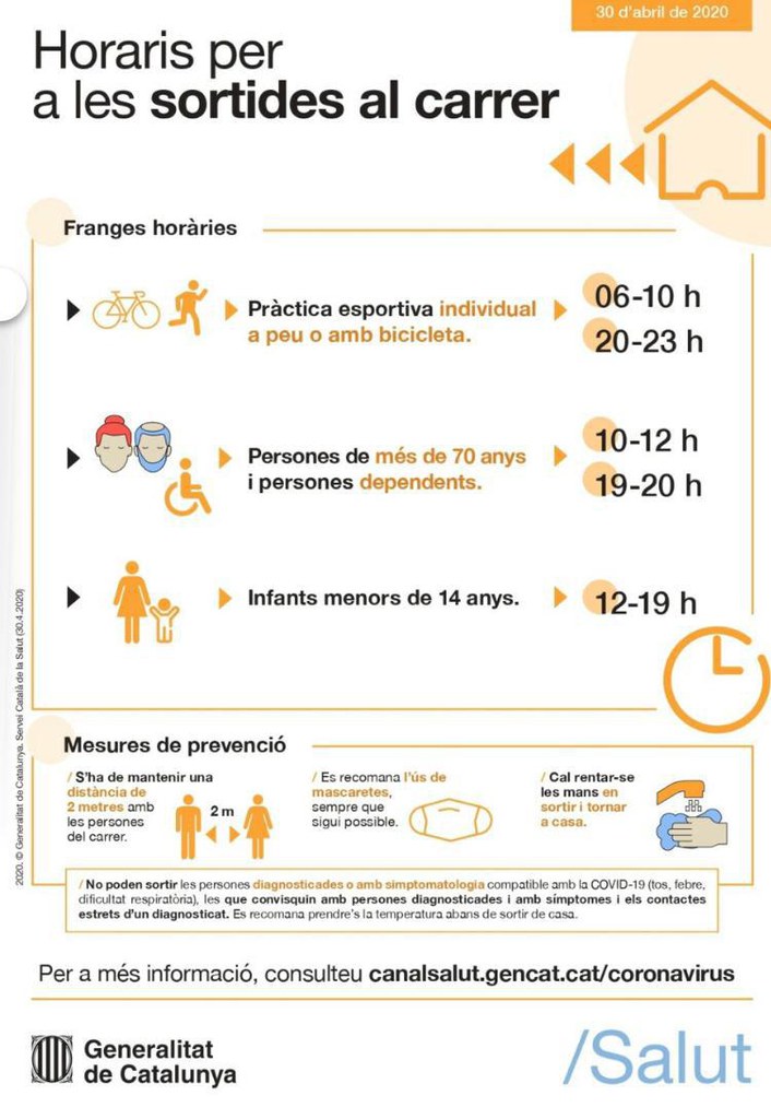 A partir del dissabte 2 de maig, inclòs (els menors d’edat fins a 13 anys podien sortir a passejar, acompanyats d’un adult, des del diumenge 26 d’abril).