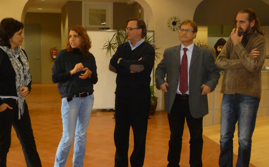 Anna Erra, Núria Homs, Josep M. Vila d’Abadal, Xavier Farrés i Josep Rafús en un moment de la visita a la nova seu.