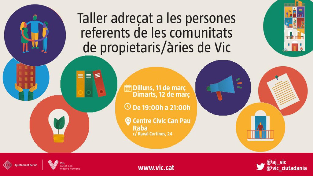 L’Ajuntament de Vic organitza un taller dirigit a les persones referents de les comunitats de propietaris i propietàries, emmarcat en el programa Veïnat+, per proposar diferents solucions a les diverses comunitats de propietaris i propietàries, i que s’oferirà dos dies: L’11 o el 12 de març.