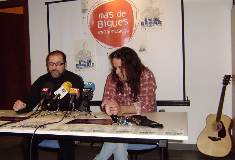 Ahir a la tarda es va presentar el Mas de Bigues la tercera edició del Festival de Blues de Vic. La presentació va anar a càrrec de l’organitzador del l’esdeveniment i membre de Fressa, Manel Manzano i el responsable de Mas de Bigues, Jaume Soler. Manzano va explicar que aquest any s’obre un nou escenari i el festival s’allarga un dia més. El nou espai és la Jazz Cava, ja que les anteriors edicions totes les actuacions tenien lloc al Casino de Vic. El divendres, dia 5 de novembre, la Jazz Cava acollirà el concert gratuït del segon disc de Walking Stick Man que donarà el tret de sortida al Festival de Blues de Vic. El certamen compta amb el cap de cartell Amadeu Casas que actuarà el pròxim dissabte, dia 6 de desembre a les 23.00h al Casino de Vic. El dia abans, però, el divendres dia 5 de desembre a les 19.30h, farà una master class de guitarra al Mas de Bigues que serà gratuïta pels alumnes de l’Escola de Música de Vic , persones amb el Carnet Jove i amb el Carnet de Vic Cultura. Per la resta tindrà un cost de 5 €. Casas conjuntament amb Big Mama, August Tharrats, Dani Nel·lo i Txell Sust, forma part del panorama de Blues més seriós a Catalunya. A les 00.30 h actuarà el grup osonenc 4 Cats. Els membres de la formació són: Joan Ramon Puntí i Quim Abramo a la guitarra elèctrica; Franco Molinari amb el contrabaix; i Pep Solà a la bateria. El cost dels dos concerts és de 10 €, excepte els alumnes de l’Escola de Música de Vic, persones amb Carnet Jove i persones amb el carnet de Vic Cultura que poden obtenir entrades per 5 €. Per la seva banda, Jaume Soler, va manifestar que des de l’organització es pretén que any rere any el festival agafi nom i es consolidi; a banda d’apropar aquest estil musical a la societat.