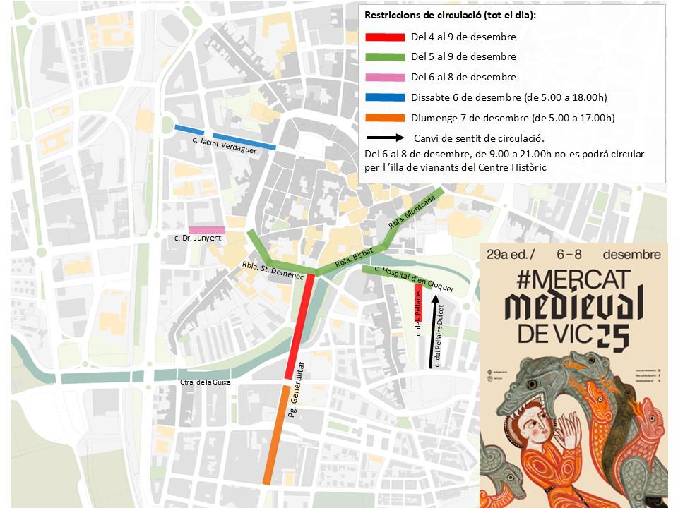 Durant els dies del Mercat Medieval, diversos carrers del centre de Vic experimentaran talls i modificacions de circulació per garantir la seguretat i facilitar el muntatge i desenvolupament del Mercat. Les afectacions concretes són les següents: