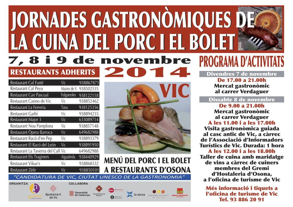 Les Jornades gastronòmiques de la cuina del porc i el bolet les organitzen conjuntament el Gremi d’Hostaleria d’Osona i l’Ajuntament de Vic amb l’objectiu de donar a conèixer el bo i millor de la cuina de la comarca, i promoure la Candidatura Vic, Ciutat UNESCO de la Gastronomia. Els tiquets per a les diferents activitats i tota la informació de les Jornades gastronòmiques ja es pot trobar a l’oficina de turisme de Vic (Tel. 938862091