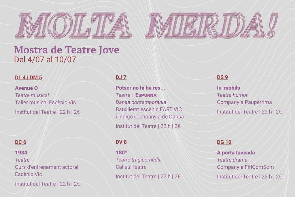 Vic acull  una nova edició Molta Merda!, la Mostra de Teatre Jove, organitzada per l’Ajuntament de Vic a partir de la regidoria del Vicjove i amb la col•laboració de l’Institut del Teatre - Centre de Vic i l’Escènic Vic. L’edició d’enguany es desenvolupa del 4 al 10 de juliol, coincidint amb la Festa Major, a l’Institut del Teatre del carrer Sant Miquel.