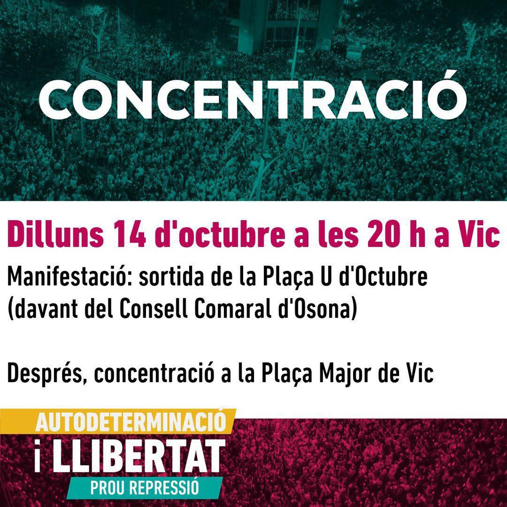 Tindrà lloc avui dilluns, 14 d’octubre, a dos quarts de 7 de la tarda i demanarà l’amnistia pels polítics presos catalans i en defensa del dret d’autodeterminació