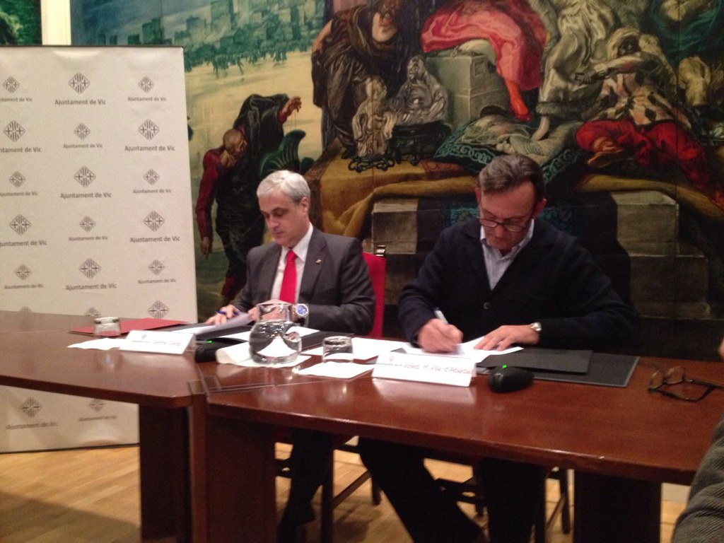 El conseller de Justícia, Germà Gordó, i l’alcalde de Vic, Josep M. Vila d’Abadal, han signat aquesta tarda el protocol d’actuacions que farà possible, a més a més, “unes instal•lacions més modernes i poder desenvolupar la nova oficina judicial”