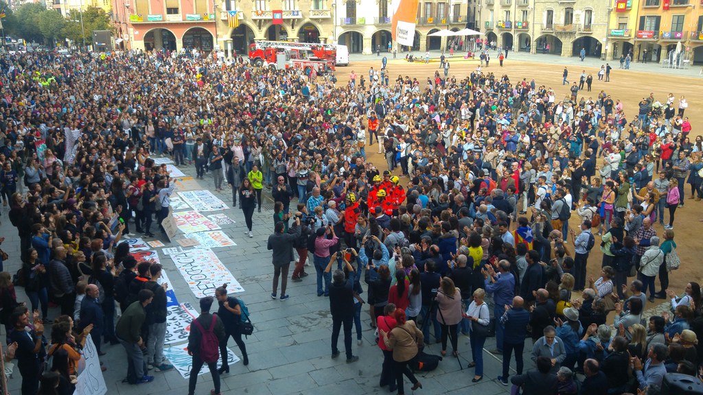 Centenars de persones han omplert la plaça Major de Vic aquest migdia per mostrar el seu rebuig a la greu vulneració de drets i llibertats per part de l’Estat espanyol, en el marc de la celebració del referèndum d’ahir.