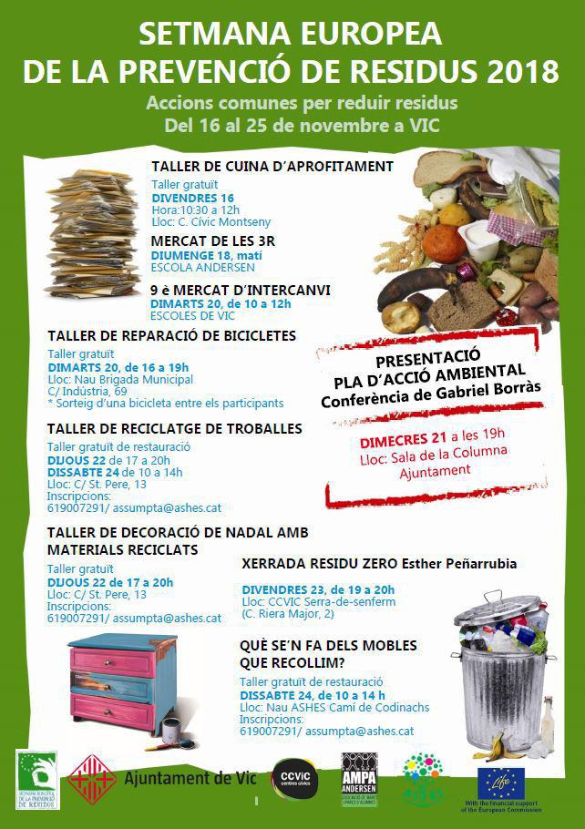 Del 16 al 25 de novembre, la ciutat de Vic se suma als actes de la Setmana Europea de la Prevenció de Residus, que se celebrarà paral·lelament arreu d’Europa. Els objectius d’aquesta iniciativa són diversos, entre ells donar a conèixer estratègies de reducció de residus, fomentar accions sostenibles per reduir els residus i fer canviar els hàbits quotidians de consum i producció dels ciutadans.
