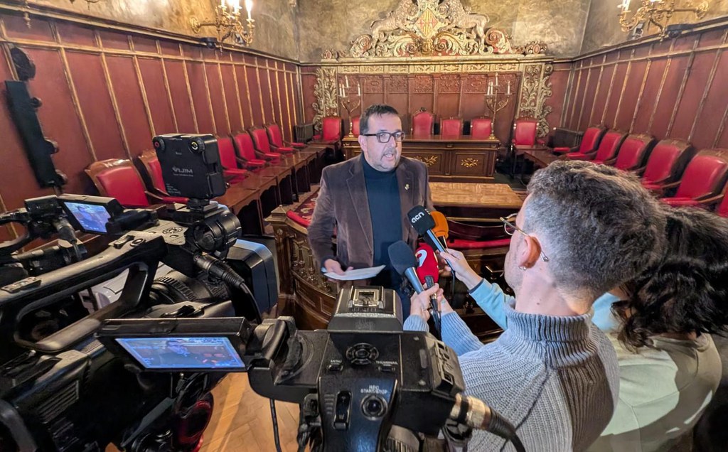 L’alcalde de Vic, Albert Castells, atenent els mitjans de comunicació a la Sala de plens del consistori vigatà.