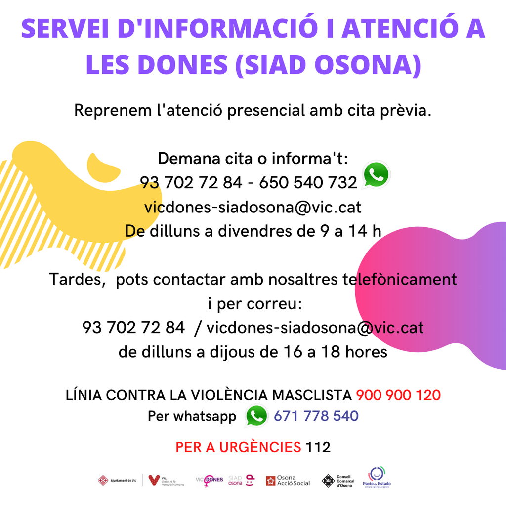 El Servei d’Informació i Atenció a les Dones (SIAD Osona) i el Servei d’Atenció a la Diversitat Sexual i Identitats de Gènere (SAI LGTBI Osona) reprenen l’atenció presencial amb cita prèvia de dilluns a divendres de 9 del matí a 2 de la tarda. Per demanar cita o qualsevol informació sobre qualsevol d’aquests serveis es pot trucar als telèfons 93 702 72 84 i al 650 540 732 (whatsapp), o bé es pot enviar un correu electrònic a l’adreça vicdones-siadosona@vic.cat. De dilluns a dijous, de 4 a 6 de la tarda, també s’atendran trucades telefòniques i es rebran correus electrònics.