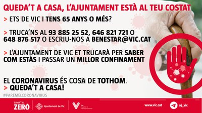10/04/2020 L’Ajuntament telefona a les persones de 65 anys o més de Vic durant el període de confinament Compartir: L’Ajuntament telefona a les persones de 65 anys o més de Vic durant el període de confinament Facebook Twitter Whatsapp Email