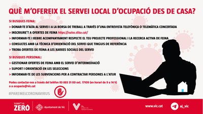 31/03/2020 El Servei Local d’Ocupació de Vic manté la seva activitat habitual per a usuaris i empreses a distància Compartir: El Servei Local d’Ocupació de Vic manté la seva activitat habitual per a usuaris i empreses a distància Facebook Twitter Whatsapp Email
