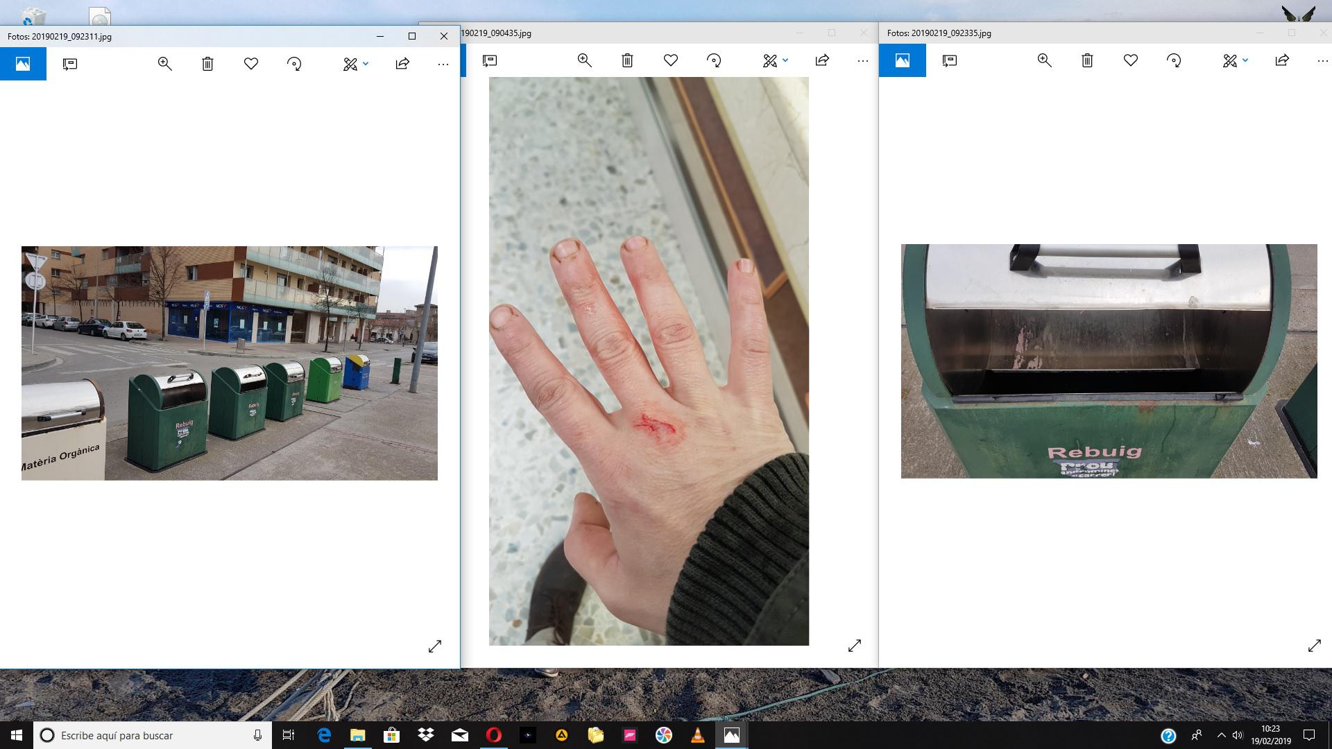 Adjunto aquesta imatge perquè vegin com m'he tallat en dipositar una bossa d'escombraries en aquest contenidor. És molt fàcil tallar-se perquè està molt afilat. Ho faig perquè no li passi a ningú més o a alguna criatura.