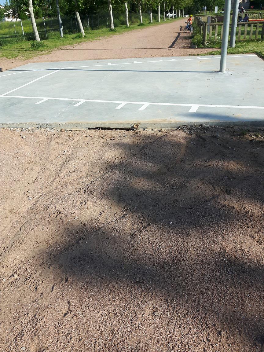 Caldria arreglar la terra al voltant de la nova pista de basquet del parc de Sant Llàtzer. S'ha fet malbé amb la pluja, i molts nens petits ensopeguen fent-se mal.