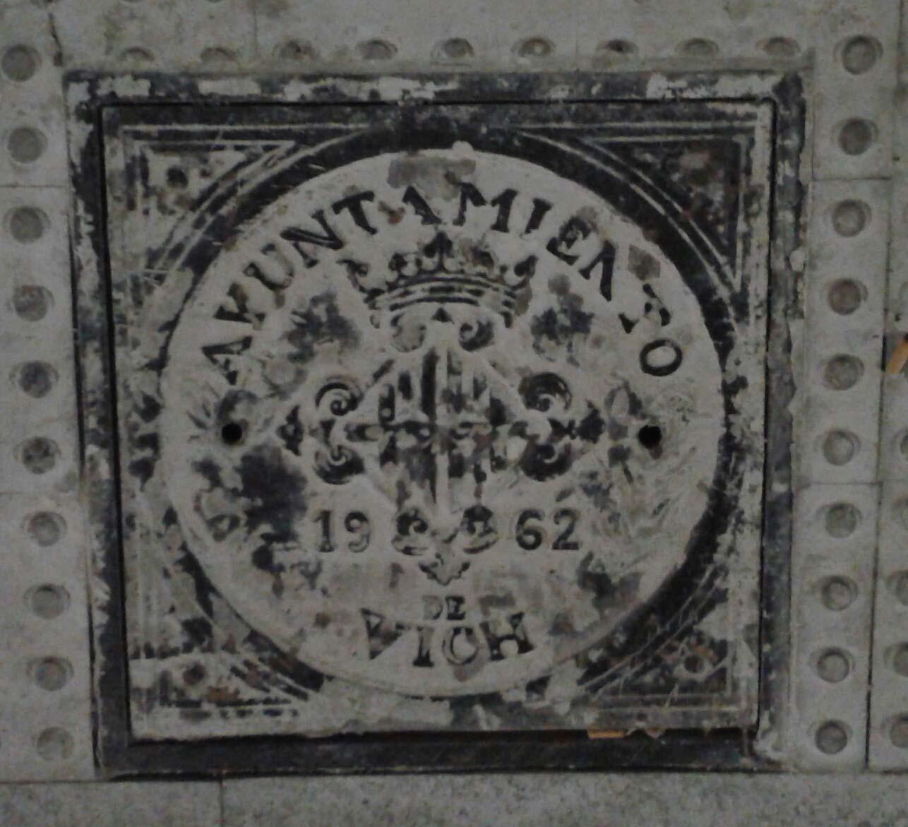 Acabades les obres del carrer de Montserrat, em sorprèn veure una tapa de l' AYUNTAMIENTO DE VICH 1962. No sé si és una peça històrica que calia preservar; si és per no malgastar posant-ne una de més actual originant una despesa considerada innecessària; si és perquè "Ui !, no ens n'havíem adonat"... Passada la sorpresa inicial no sé si felicitar algú o criticar-lo, ja que en desconec la intenció.