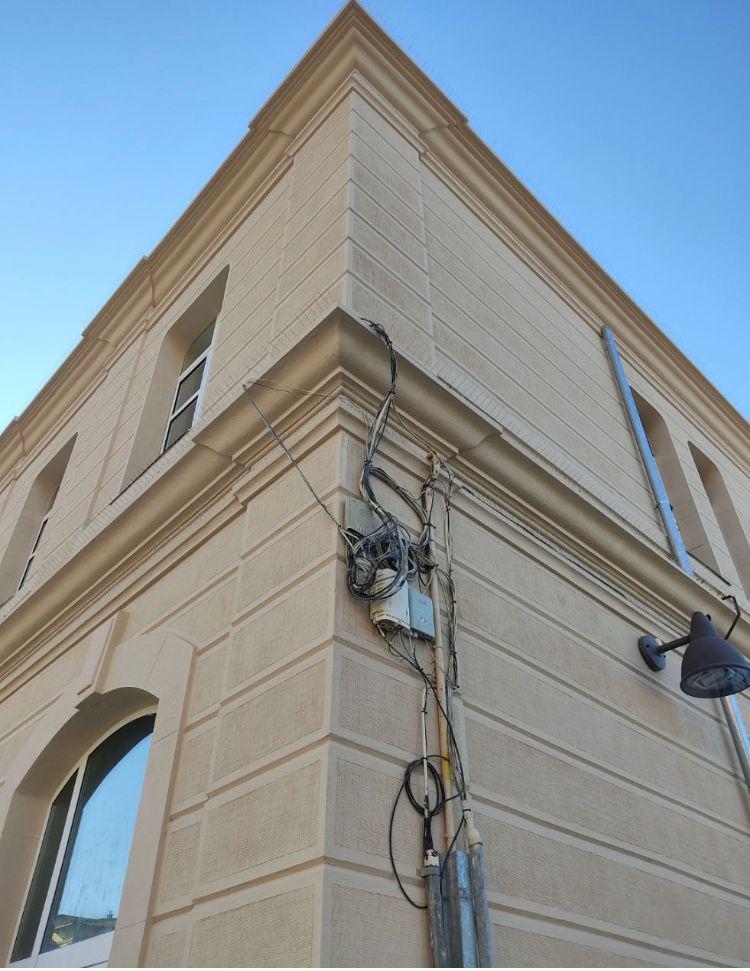Un cop acabades les obres de la façana de l'estació de tren, han deixat aquests cables així de mal col·locats. Estaria bé que es posessin bé.
