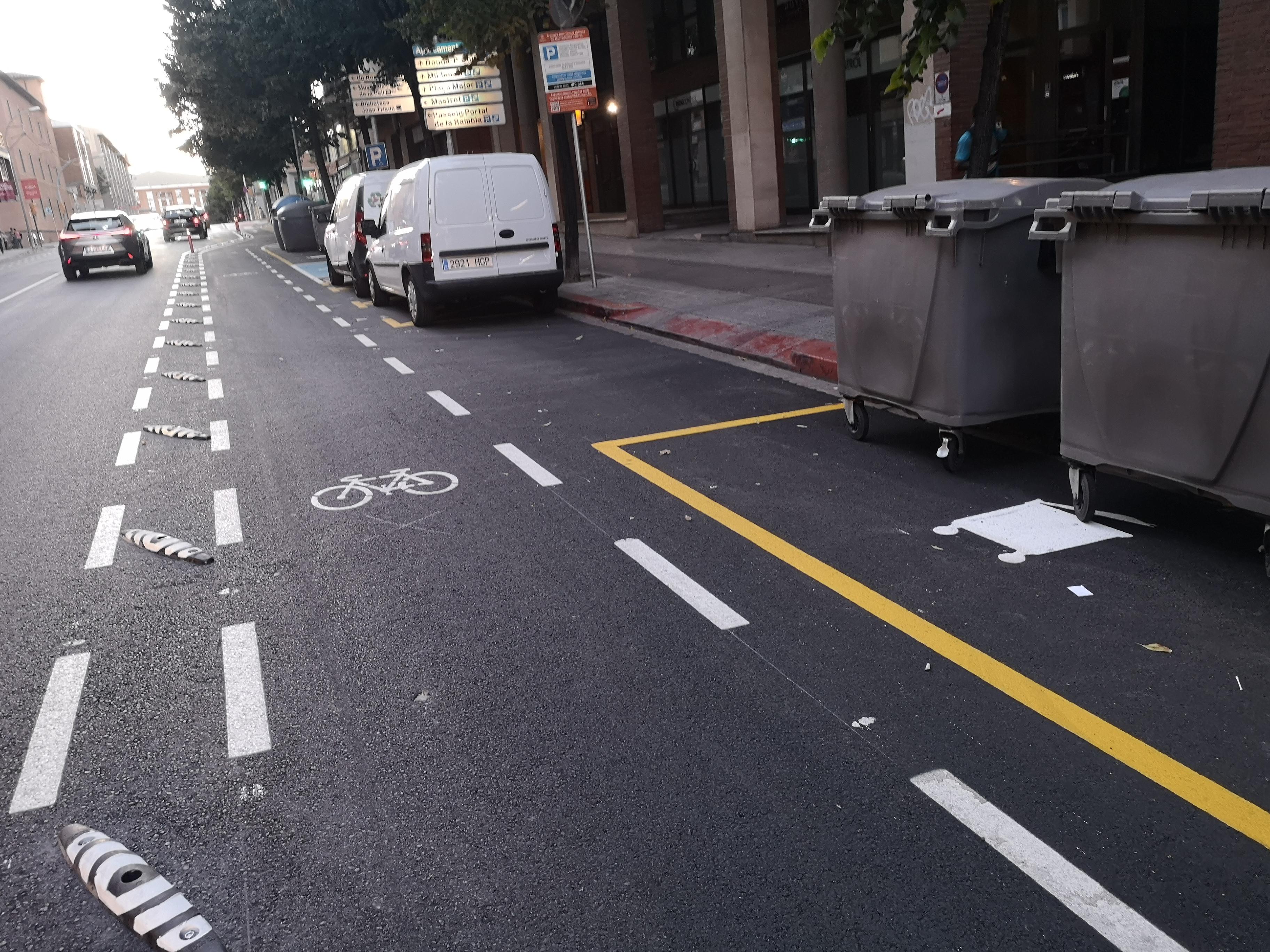 A les entrades de garatges hi posem separadors més baixos que a la resta de trams. Aquests separadors els poden sobrepassar bé amb els vehicles i no hi ha perill que els vehicles es malmetin. La separació que es deixa entre les peces s'entèn que és suficient per a passar amb motocicleta sense tocar-los. Considerem que cal mantenir la tira de separadors del carril de circulació de vehicles motoritzats del de bicicletes i vehicles de mobilitat personal per tal de poder continuar mantenint la separació física entre ambdós carrils i alhora, que el creuament del carril bici per part dels vehicles es faci de forma prudent i segura.
