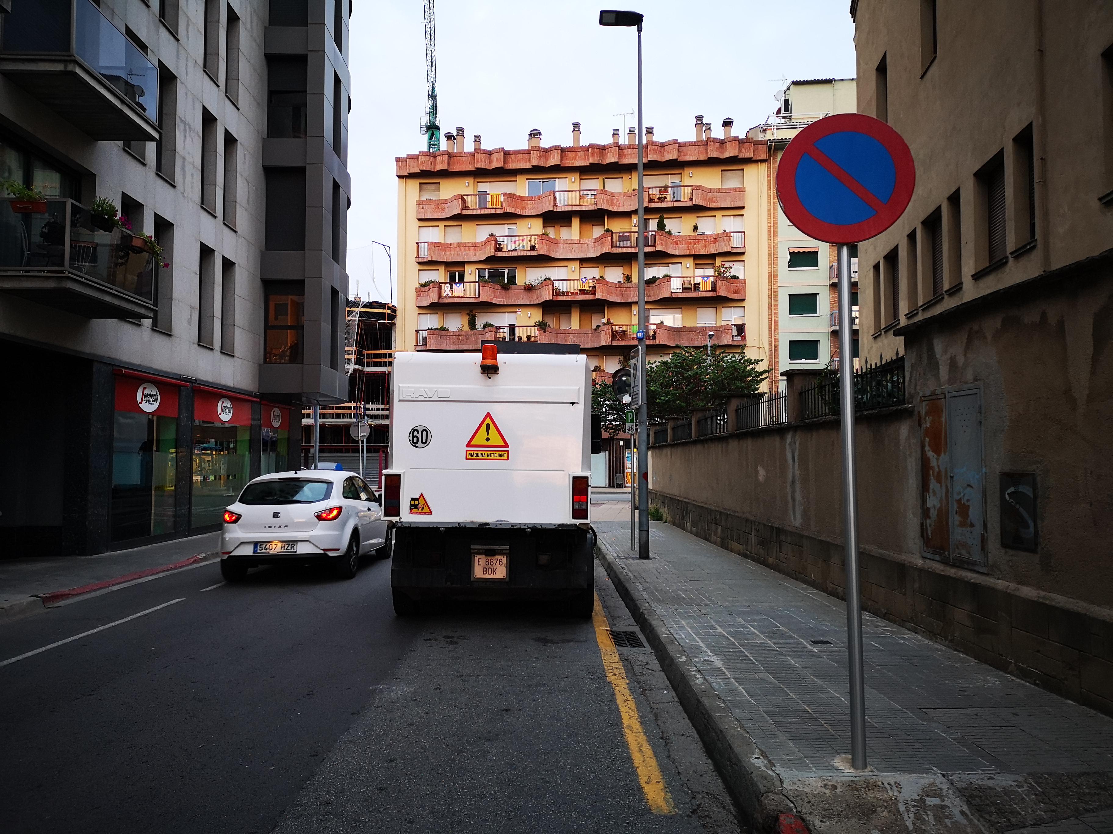 La foto està feta al carrer Dr . Salarich tocant al passeig de la Generalitat. El lloc és un espai on no es pot aparcar (senyal de prohibit + línia groga) però habitualment hi ha cotxes aparcats que dificulten l'entrada a un pàrquing . El cotxe de neteja viària és un habitual poc abans de les 8 del matí. Agrairia que expliquéssiu a aquests treballadors què significa el senyal de prohibit aparcar. També que la guàrdia urbana es deixés veure més pel barri per evitar situacions com aquesta i d'altres força pitjors i perilloses, sobretot als vespres / nits. La veritat és que ens trobem força desemparats els que vivim a aquesta part del riu, no és el que esperem d'un Ajuntament que a l'acostar -se les eleccions, segur que ens dirà que tots els barris som iguals.
