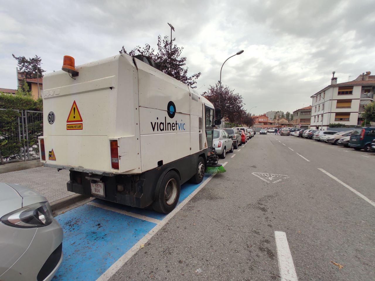 La maquinària de Vialnetvic hauria d'aparcar a la seva nau, i no a les places d'aparcament per a persones amb mobilitat reduïda (imatge d'aquest diumenge 23/10 al c. de Pere II el Gran).
