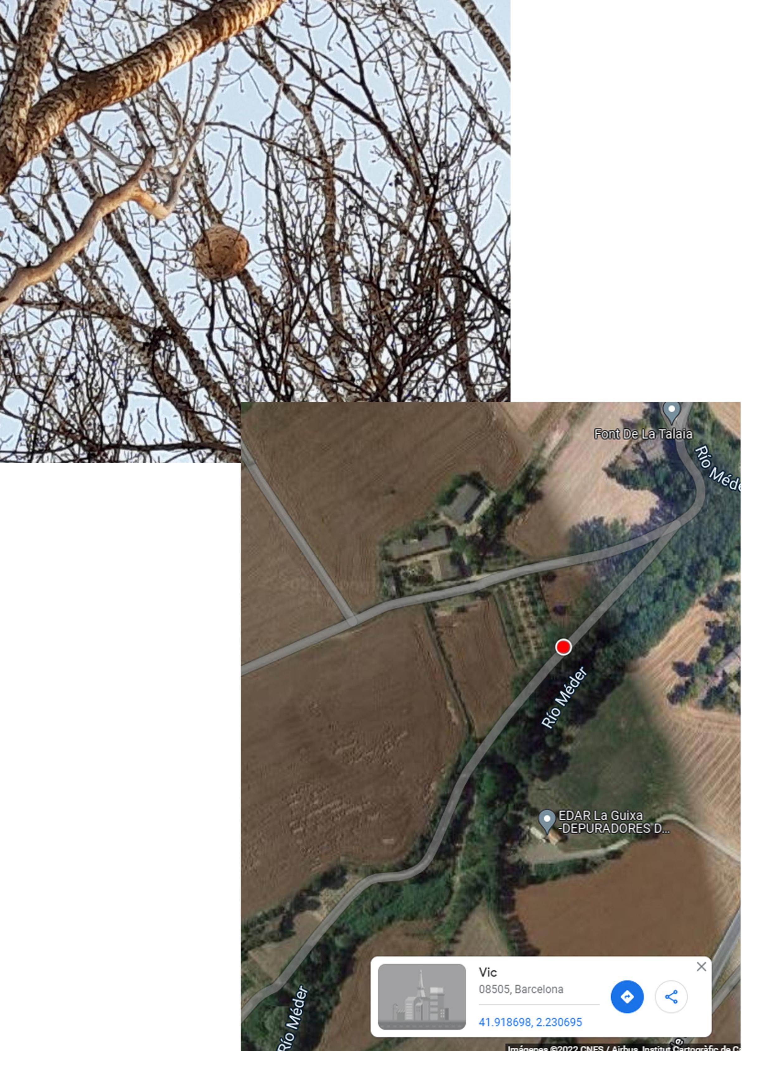 Us notifico que en el tram del Camí de Sant Jaume molt a prop de La Guixa, aproximadament davant el mas Can Salgot (us envio foto amb les coordenades) dalt d ' un dels pollancres hi ha un rusc de vespes asiàtiques.